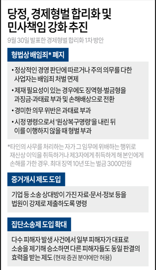 당정은 이 같은 경제형벌 합리화 방안을 추진하는 한편 민사 책임을 강화하는 방안도 논의했다.증거개시 제도, 집단소송제 도입 확대 등이 대표적이다.증거개시 제도는 기업 등 소송 상대방이 가진 자료, 문서, 정보 등을 법원이 강제로 제출하도록 명령할 수 있도록 하는 것이다.현재 민사소송에서는 피해자가 기업 내부 자료를 확보해 피해 사실을 입증하기 현실적으로 어렵다는 점을 고려해 증거개시 제도가 필요하다는 지적이 많았다.집단소송제의 경우 다수 피해자가 발생한 사건에서 일부 피해자가 대표로 소송을 제기해 승소하면 다른 피해자들도 동일한 판결의 효력을 받는 제도를 말한다. 현재 국내에선 증권 분야에만 집단소송이 허용된다.권 의원은 "이들 제도를 통해 실질적인 피해자 보호를 끌어내겠다는 취지"라고 설명했다. "배임죄 요건이 추상적이고 범위가 너무 넓어 기업의 정상적인 경영 활동을 위축한다는 지적이 지속됐다"며 "이를 해결하기 위해 기본적으로 형법상 배임죄를 폐지하되 합리적 대체 입법안을 마련해 입법 공백이 없게 하겠다"고 강조했다.