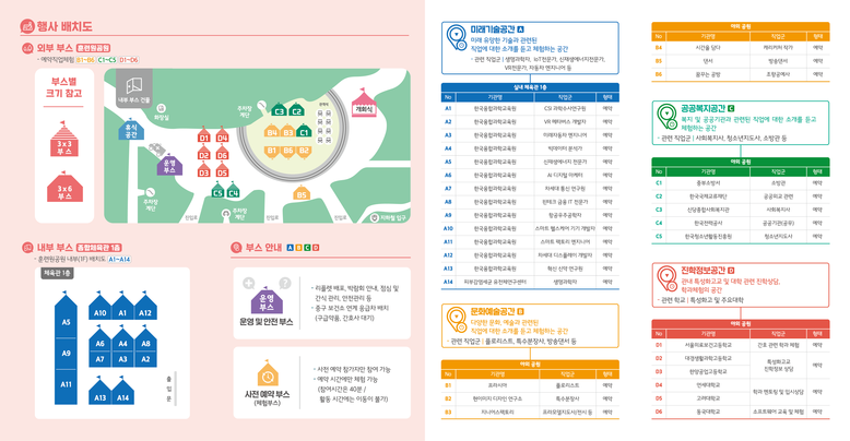 문화예술 부스에서는 프라모델지도사, 업사이클링 공예 등의 직업을, 공공복지 부스에서는 공공외교 전문가, 사회복지사 등의 직업을 알아볼 수 있다. 연세대, 고려대, 동국대와 관내 특성화 고교가 참여하는 진학정보 부스에서는 대학 및 특성화고교 관련 진학상담과 함께 학과 체험을 해 볼 수 있다.