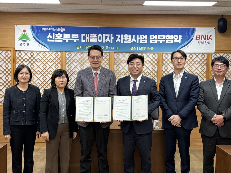 울주군과 BNK경남은행 울산영업그룹은 이날 군청 은행나무홀에서 이순걸 울주군수와 황재철 BNK경남은행 울산영업그룹장 등이 참석한 가운데 신혼부부 대출이자 지원사업 업무협약식을 가졌다.