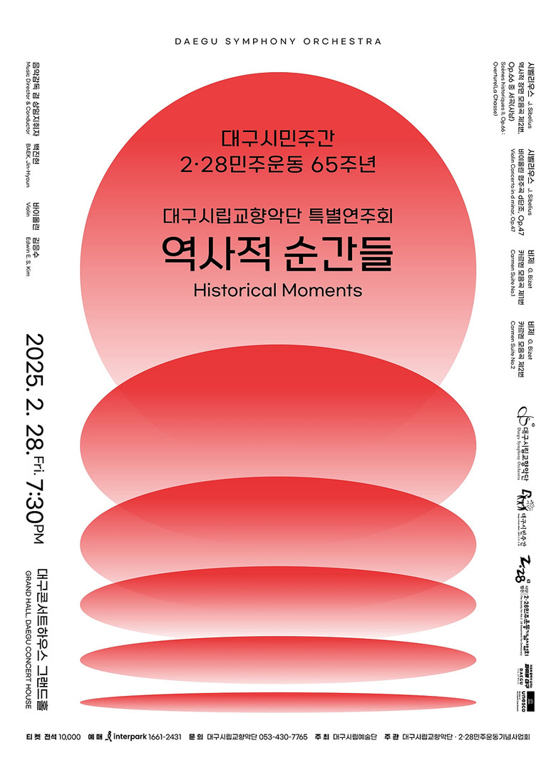 ▸ 국민음악가 시벨리우스 관현악곡, 바이올린 협주곡 정통 클래식 선사 [세계타임즈=대구 한윤석 기자] 대구시립교향악단이 대구시민주간 및 2.28민주운동 65주년을 맞이해 특별연주회 ‘역사적 순간들’을 오는 2월 28일(금) 오후 7시 30분 대구콘서트하우스 그랜드홀에서 개최한다.
