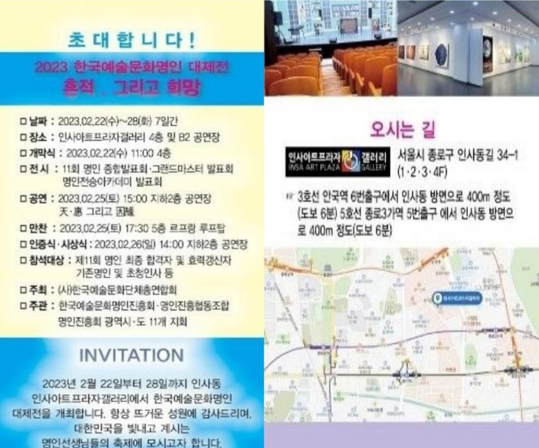 [세계타임즈 백진욱 기자] 이번 2월 22일(수)부터 28일(화)까지 (사)한국예술문화단체총연합회(이하 한국예총)가 주최하고 한국예술문화명인진흥회(이하 명인진흥회)가 펼치는 2023 한국예술문화 명인대제전 『흔적, 그리고 희망』의 축제가 인사동 소재 인사아트프라자 F4 갤러리와 B2 공연장에서 펼쳐진다.