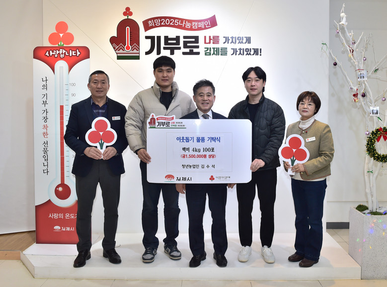 [김제 = 세계타임즈 김서주 기자] 김제시(시장 정성주)는 18일 청년농업인 김 수석 씨가 연말을 맞아 백미 4kg 100포(150만 원 상당)를 기탁하며 이웃 사랑을 실천했다고 밝혔다.
