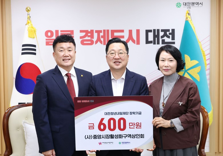 이날 기탁식에는 이장우 대전시장, 박황순 중앙시장활성화구역 상인회장, 권형례 대전청년내일재단 대표이사가 참석했다.