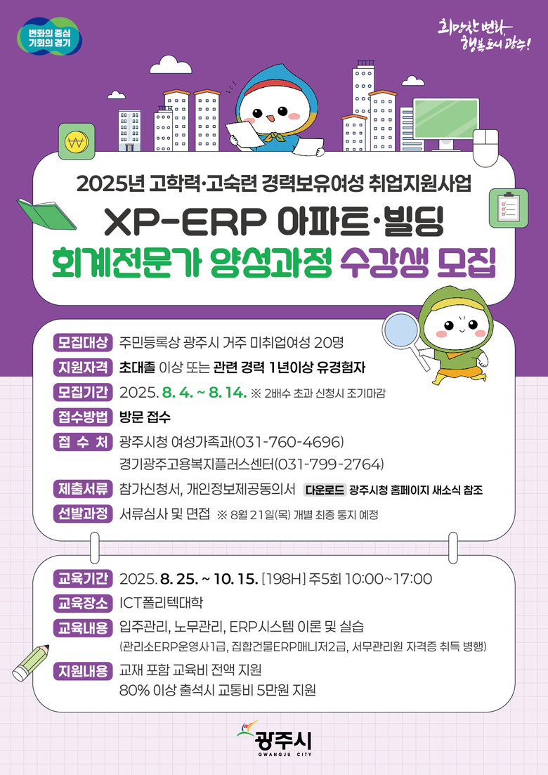 모집 대상은 광주시에 주민등록이 되어 있는 미취업 여성 20명이며 초대졸 이상 또는 관련 경력 1년 이상의 유경험자가 지원할 수 있다. 신청은 광주시청 홈페이지 ‘새소식’에서 신청 서식을 내려받은 후 광주시청 여성가족과(031-760-4696) 또는 경기광주고용복지플러스센터(031-799-2764)를 직접 방문해 접수하면 된다.