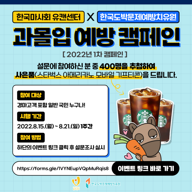 한국마사회 유캔센터는 방역 안전을 위해 기존의 현장 캠페인과 더불어 온라인 캠페인 강화에 힘쓰고 있다. 코로나19로 정상적인 경마가 열리지 않던 21년 에도 3만7천명 이상이 온라인 캠페인을 통해 과몰입 예방 활동에 참여했다. 마사회는 한도원과 함께 10월에도 동 캠페인을 추가 실시할 예정이며, 오는 9월과 11월에는 한국마사회 전자카드앱을 활용한 과몰입 자가진단 자체 캠페인도 진행할 예정이다.