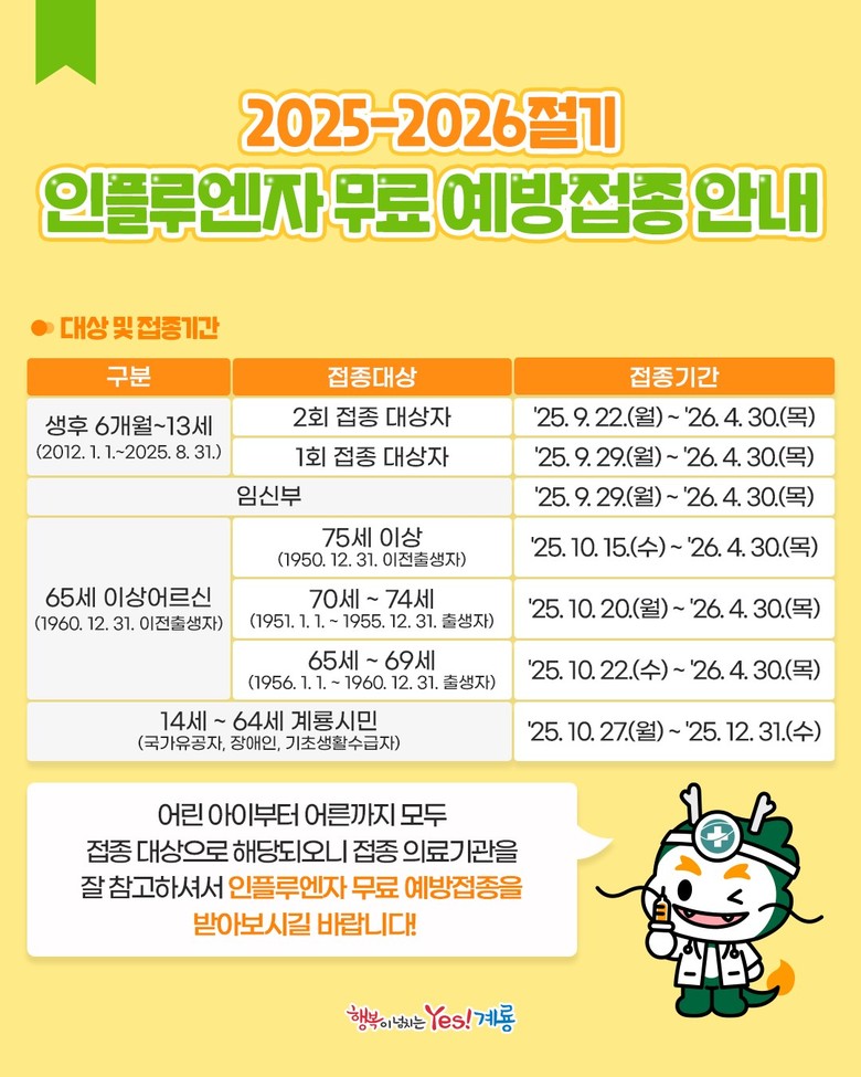아울러, 백신이 소진될 때까지 관내에 거주하는 14세∼64세 국가유공자, 장애인, 기초생활수급자를 대상으로도 무료 예방접종을 실시할 계획이다.