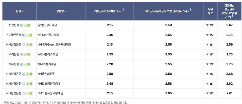 5대 은행 정기예금 대표 상품 금리[은행연합회 소비자포털 공시 캡쳐]