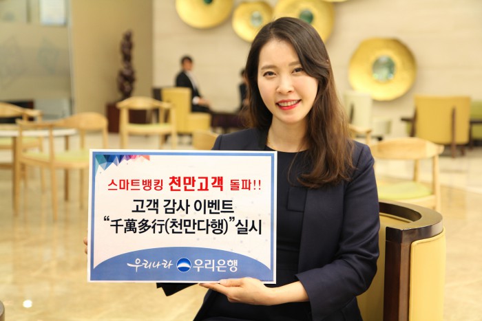[세계타임즈 이현재 기자] 우리은행이 스마트뱅킹 가입고객 1000만명 돌파를 기념해 '천만고객이 행복해지는 천만다행(千萬多幸) 감사 이벤트'를 3일부터 내년 1월말까지 진행한다.