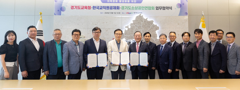 [경기도 세계타임즈=송민수 기자] 경기도교육청(교육감 임태희)이 1일 남부청사에서 경기도소상공인연합회(회장 이상백), 한국교직원공제회(이사장 정갑윤)와 ‘지역경제 활성화를 위한 상생 업무협약’을 체결했다.