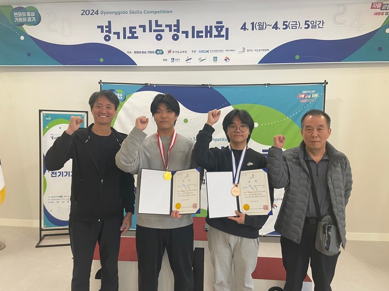 이번 경기도기능경기대회에 전기기기 직종에 출전한 디지털전기과 3학년 최지훈(지도교사 김주형), 디지털전기과 2학년 이재경(지도교사 정명혁) 모두 각각 금메달, 동메달을 획득함으로써 명문 특성화고등학교로의 위상을 다시 한번 더 확인할 수 있었다.