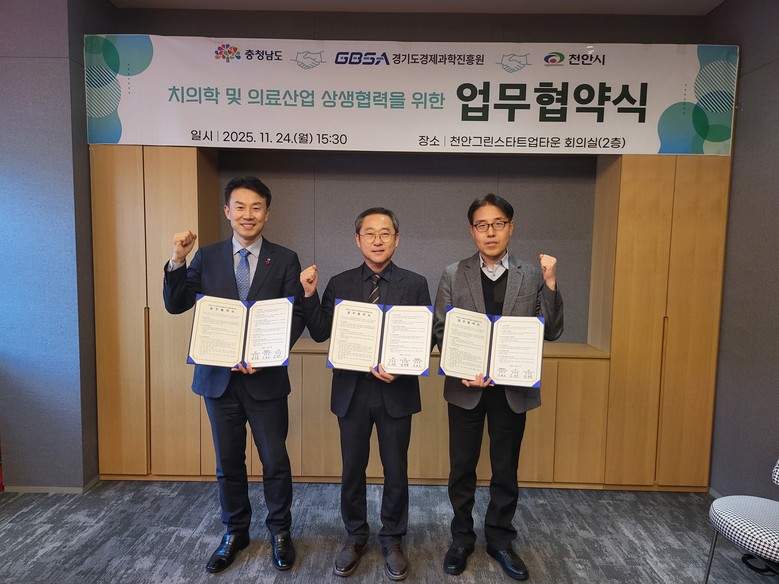 도는 24일 천안시 그린스타트업타운에서 천안시, 경기도경제과학진흥원과 국립치의학연구원 천안 설립 및 치의학산업 육성을 위한 초광역 협력 업무협약(MOU)을 체결했다고 밝혔다.
