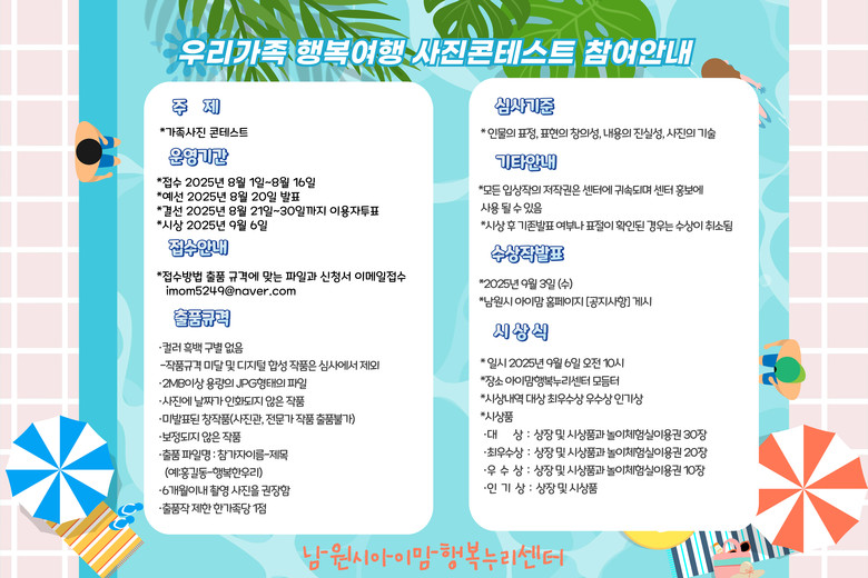 남원시 아이맘행복누리센터(센터장 곽미라)는 “이번 행사를 통해 영유아들이 남원시에서 즐거운 여름방학 추억을 만들 수 있기를 희망한다”라고 밝혔다.