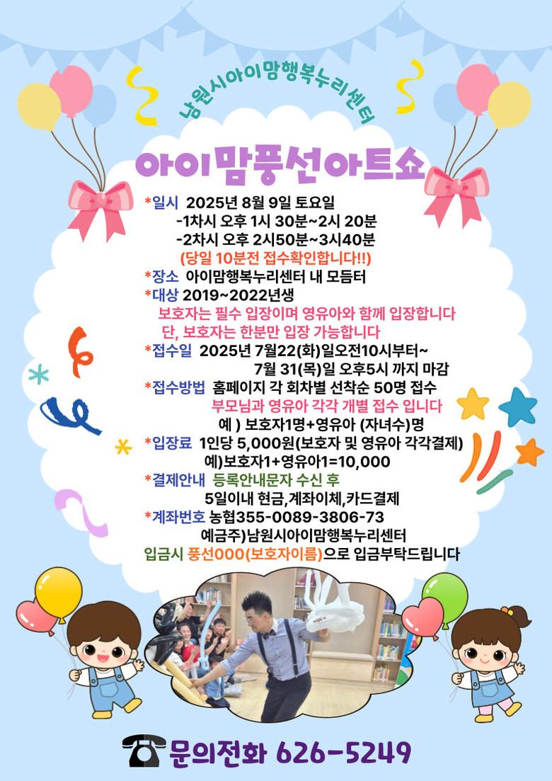 풍선아트쇼는 8월 9일 오후 1시 30분과 2시 50분, 2회 진행되며, 관람료는 1인당 5,000원이다. 신청은 오는 7월 22일부터 7월 31일까지이며 남원시 아이맘행복누리센터 홈페이지를 통해 접수한다.