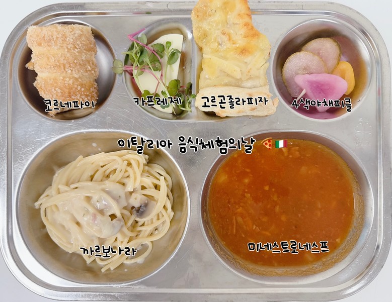 은계유치원 식생활교육관에서는 이탈리아의 대표적인 음식인 까르보나라, 미네스트로네스프, 고르곤졸라피자, 카프레제, 코르네파이를 식단으로 제공하여 유아들에게 이탈리아의 다양한 음식을 경험해볼 수 있도록 하였다.