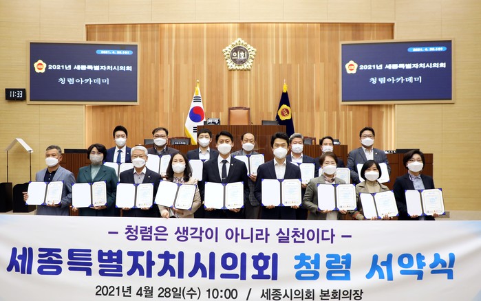 [세종=세계타임즈 이채봉 기자] 세종특별자치시의회(의장 이태환)는 28일 본회의장에서 청렴의식 확산 및 청렴한 의정문화 조성을 위해 의원 전원 및 사무처 직원을 대상으로 청렴아카데미를 개최한 데 이어, 청렴도 향상 종합대책을 발표했다.