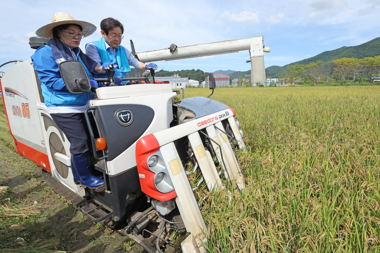 24일 오전 전남 곡성군 석곡면 논에서 이재명 더불어민주당 대표가 콤바인을 몰고 있다. 2024.9.24