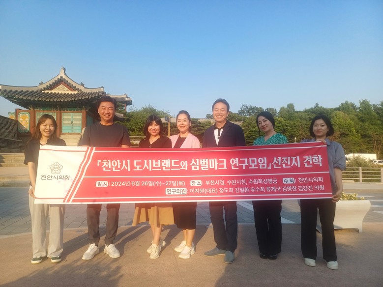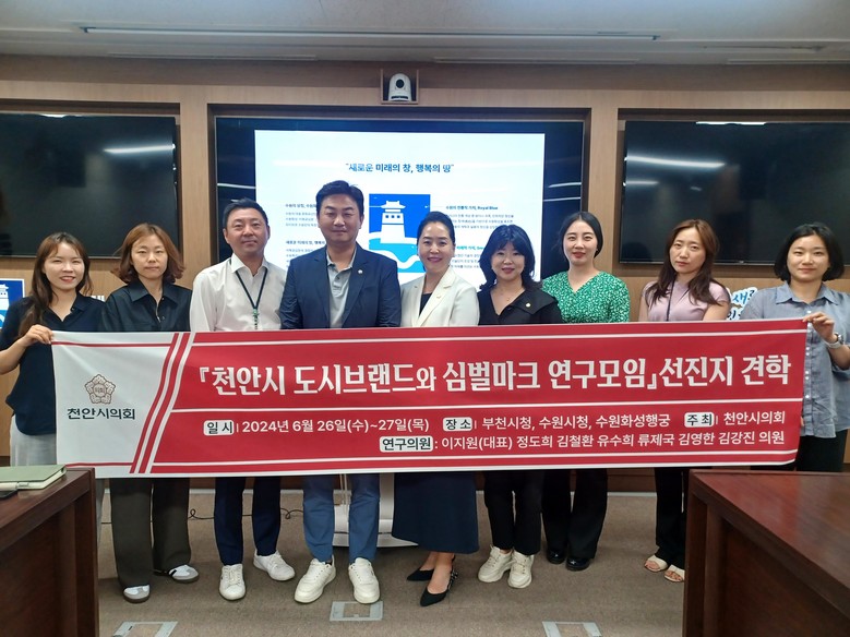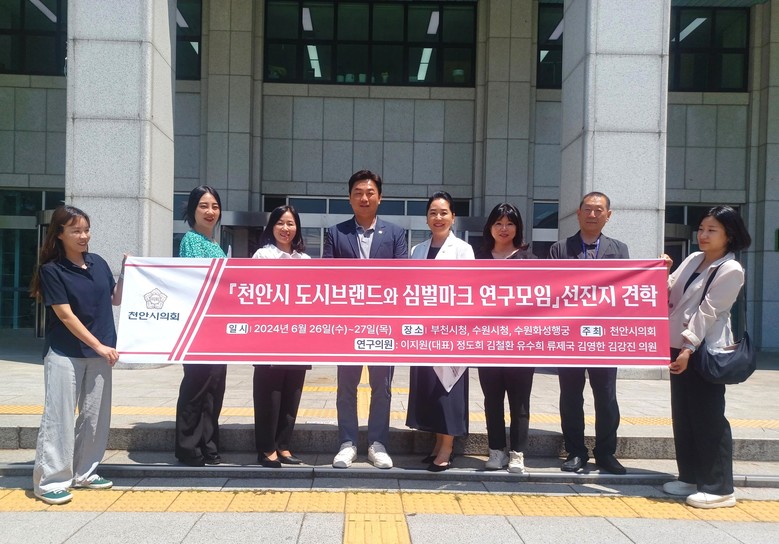 [천안시 세계타임즈=백택기 기자] 천안시의회 「천안시 도시브랜드와 심벌마크 연구모임」(대표의원 이지원)이 국내 심벌마크 교체 우수사례를 연구하기 위해 26일~27일 부천시, 수원시를 방문했다. 이번 견학에는 연구모임 소속의원, 천안시 정책기획과장, 정책연구원 등이 참석했다.