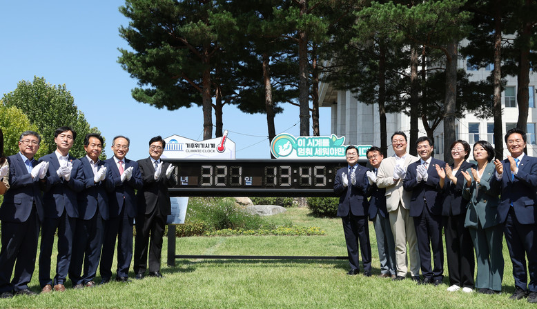 [세계타임즈 = 이채봉 기자] 국회가 경내 한편에 있었던 기후 위기 시계를 본회의장이 있는 중앙의 본청 건물 앞으로 옮기고 기후 위기에 총력 대응할 것을 다짐했다.국회사무처는 지구의 날이었던 지난 4월 22일 국회 내 좌측 구석에 있는 수소충전소 근처에 시계를 설치한 바 있다.기후재앙을 막기 위한 마지노선으로 여겨지는 지구 평균기온 1.5℃ 상승까지 남은 시간을 보여주는 시계다. 이날 오전 11시 30분 현재 남은 시간은 4년 321일 13시간이다.우원식 국회의장은 이날 시계 이전 행사에서 이젠 기후 위기의 심각성을 인식하는 수준으론 안 된다며 비상한 각오로 절박하게 실천하고 행동해 온실가스 배출량을 줄여야 한다고 강조했다.우 의장은 시계 이전 설치가 국회가 기후 위기 대응에 앞장서고 탄소중립에 모범이 되겠다고 국민에게 약속하는 계기가 되길 바란다며 시기를 놓치면 안 된다. 22대 국회를 기후 국회로 꼭 만들자고 당부했다.우 의장은 관련한 국회의원 입법·정책활동 지원, 국회 탄소중립 로드맵 수립, 국회 내 재생 에너지 설비 확충, 일회용품 줄이기 등을 제안하고 국회 세종의사당을 기후 국회의 상징물로 건립해보자는 구상도 있다라고 언급했다.국민의힘 추경호 원내대표는 시계가 어디 있었는지 잘 몰랐다. 의원들이 함께 힘을 모으면 시계가 언젠가는 스톱되지않을까라며 여기엔 여야가 있을 수 없다. 이 문제에 관한 한 똘똘 뭉쳐 가자라고 다짐했다.더불어민주당 박찬대 원내대표도 이 자리에 추 원내대표 등 각 정당 원내대표들이 참석했는데 힘을 합해 관련 법안을 마련에 속도를 내줄 것으로 믿는다라고 말했다.박 원내대표는 제 이름이 찬대인데, 지구 온도가 올라가는 시점에서 시대정신을 반영한 이름같다라며 웃으며 말하자, 추 원내대표는 박 원내대표가 하루 한 시간씩 여기 있으면 시계가 거꾸로 갈 것이다. 기후 관련 정책 입법을 같이 생각하는 시간이 됐으면 한다. 계실 때 심심하면 저도 부르라라고 화답하기도 했다.