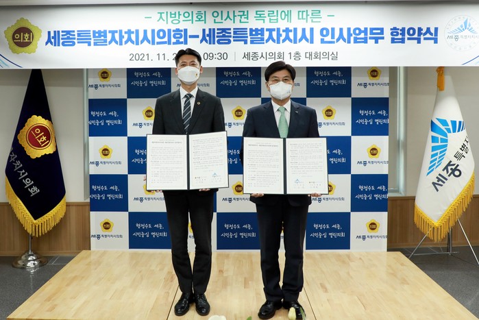 [세종=세계타임즈 이채봉 기자] 세종특별자치시의회(의장 이태환)와 세종특별자치시(시장 이춘희)는 26일 의회청사 대회의실에서 지방의회 인사권 독립에 따라 인사업무 전 분야에서 협력의 기틀을 마련하기 위해 인사운영에 관한 업무협약을 체결했다.