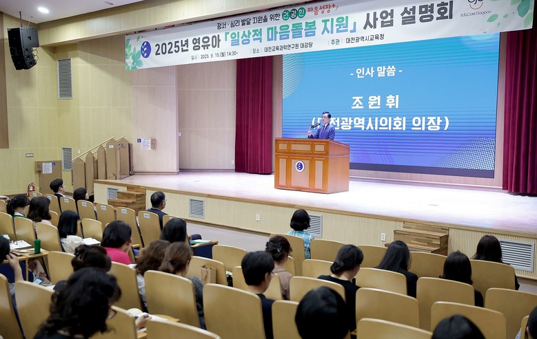 [대전 세계타임즈=이채봉 기자] 대전시의회 조원휘 의장은 15일 대전교육과학연구원에서 개최된 2025년 영유아 일상적 마음돌봄 지원사업 설명회에 참석해 보육 일선에서 최선을 다하는 보육인들께 감사를 표하고, 아이들과 보육인들 모두 행복한 보육환경 조성을 약속했다.
