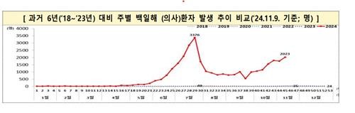 2018∼2023년 대비 주별 백일해 환자 발생 추이 비교(2024년 11월 9일 기준)