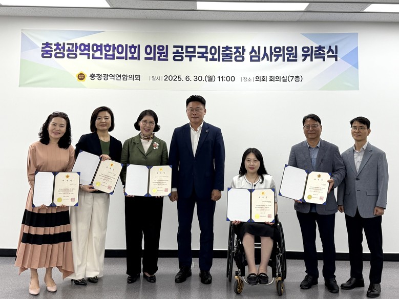 이날 의회는 ‘충청광역연합의회 의원 공무국외출장 조례’에 따라 모두 7명의 심사위원을 위촉했으며, 위원은 교육계·언론계·비영리민간단체 등에서 활동하고 있는 민간위원 5명과 연합의원 2명으로 구성됐다.