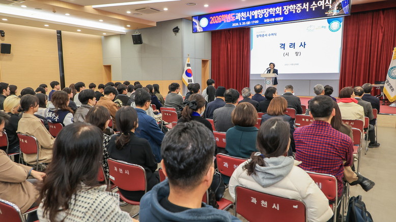 [과천시 세계타임즈=송민수 기자] 과천시 애향장학회는 지난 20일 시청 대강당에서 장학증서 수여식을 열고, 2026년 애향 장학생으로 선정된 관내 대학생 252명에게 총 7억 5천만 원의 장학금을 전달했다.