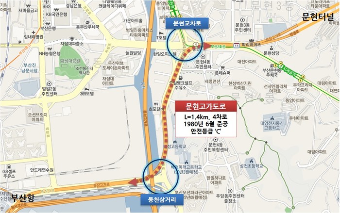 또한 문현고가차도는 1980년대에 지어져 지금까지 40년 동안 역할을 하면서, 같은 시기에 지어진 원동, 수영, 동천, (신)구서고가고 등과 비교해 안전등급도 ‘C’수준으로 안전에 위협이 되고 있으며, 보강 예산도 나날이 늘어날 것이다.