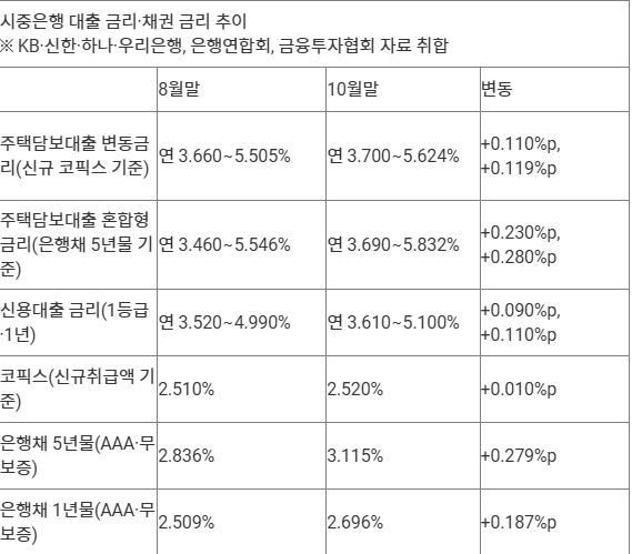 이처럼 가뜩이나 은행권에서 대출받기가 어려운 상황에서, 대출 금리까지 최근 전반적으로 오르면서 금융소비자의 부담은 더 커지고 있다.한국은행과 미국 연방준비제도(연준·Fed)의 기준금리 인하 등 통화 완화 정책이 계속 이어질지 의구심이 커지면서, 시장 금리가 최근 높아졌기 때문이다.KB국민·신한·하나·우리은행의 10월 31일 기준 주택담보대출 혼합형(고정) 금리(은행채 5년물 기준)는 연 3.690∼5.832% 수준이다. 두 달 전 8월 말(연 3.460∼5.546%)과 비교해 상단이 0.280%포인트(p), 하단이 0.230%p 높아졌다.같은 기간 혼합형 금리의 주요 지표인 은행채 5년물 금리가 2.836%에서 3.115%로 0.279%p 올랐기 때문이다.