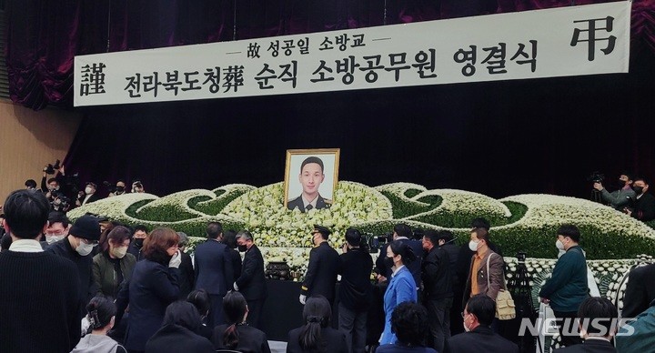 영결식에서 장례위원장인 김 지사는 "임용된 지 1년도 안 된 새내기 소방관이었다. 화재가 난 집에서 사람이 있다는 말에 뒤도 돌아보지 않고 다시 불 속으로 뛰어들었다"며 "그 마음에 고맙고, 미안하고, 가슴이 아프다. 고인은 우리를 떠났지만 그를 기억하겠다"고 했다.