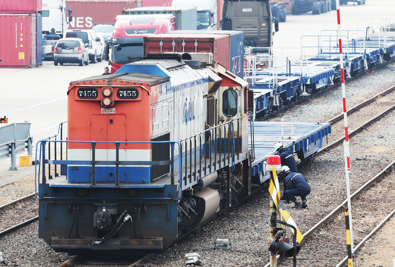 민주노총 공공운수노조 전국철도노동조합이 예고한 총파업을 하루 앞둔 10일 경기도 의왕시 내륙컨테이너기지(ICD)에서 관계자들이 화물열차를 살펴보고 있다.