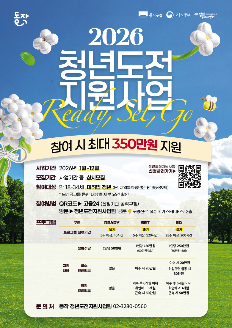 [동작구 세계타임즈=이장성 기자] 동작구(구청장 박일하)가 고용노동부 주관 공모사업인 '2026년 청년도전 지원사업'에 선정돼 참여자를 모집한다고 밝혔다.
