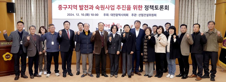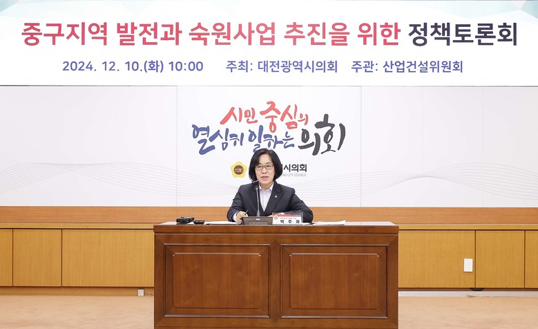 [대전 세계타임즈=이채봉 기자] 대전시의회는 산업건설위원회 박주화 의원(국민의힘, 중구1) 주재로 10일 소통실에서 ‘중구지역의 발전과 숙원사업 해결을 위한 정책토론회’를 개최하여 지역 현안에 대한 실질적인 해법 모색에 나섰다.