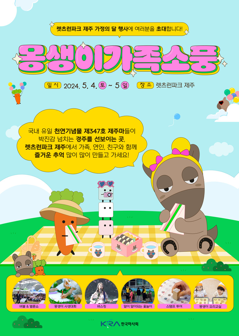 마사회 대표 캐릭터인 ‘말마(MALMA)’와 함께하는 ‘말마 패밀리 데이’, ‘블루밍 어린이날 축제’, ‘몽생이 가족소풍’ 등 지역별 이색테마와 다채로운 콘텐츠로 어린이 친구들을 맞이할 예정이다.