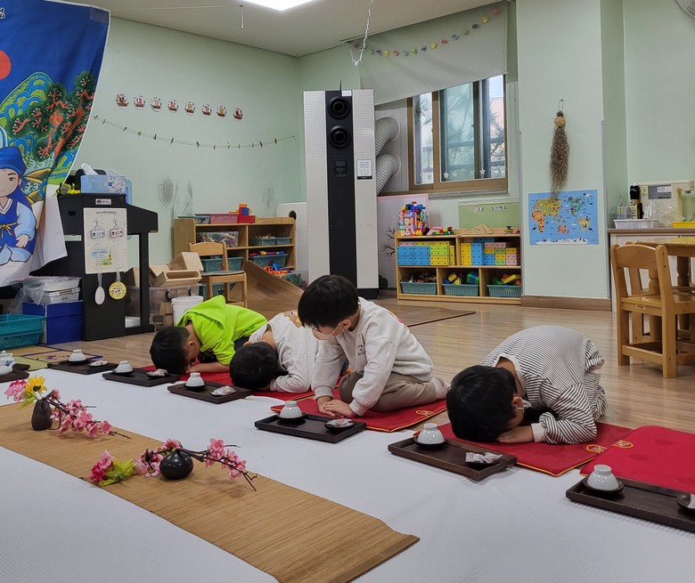 예절 및 다도 교육에서는 바르게 서는 방법, 앉는 방법, 절하는 방법 등에 대해 먼저 알아보며 예절을 익혀나갔다. 성별에 따라 달라지는 손의 위치도 배워보며 여자와 남자의 예절 차이점에 대해서도 알아볼 수 있었다. 이후에는 다관에 담긴 따뜻한 차를 찻잔에 따라 소리를 내지 않고 차를 마셔보는 교육이 이루어졌다. 마지막으로 다식 만들기 활동에서는 콩가루 반죽으로 콩다식을 만들어보는 시간을 가졌다. 콩다식을 만든 유아들은 부모님께 선물로 주고 싶다고 말하며 효를 실천하는 모습을 보였다.