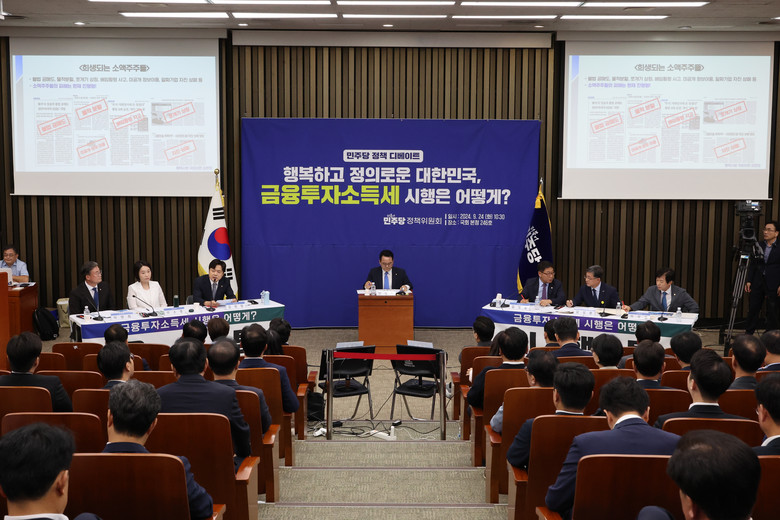 [세계타임즈 = 심귀영 기자] 더불어민주당이 24일 의원총회를 겸한 정책 토론회를 열어 금융투자소득세 시행 여부를 두고 갑론을박을 벌였다.김현정(팀장)·이소영·이연희 의원이 팀원으로 나선 유예팀은 금투세 도입 시 국내 주식시장이 위축될 가능성 등을 우려했다.김현정 의원은 금투세 도입 필요성에는 공감하지만, 자본시장 선진화와 증시 부양이 필요하다고 말했다.