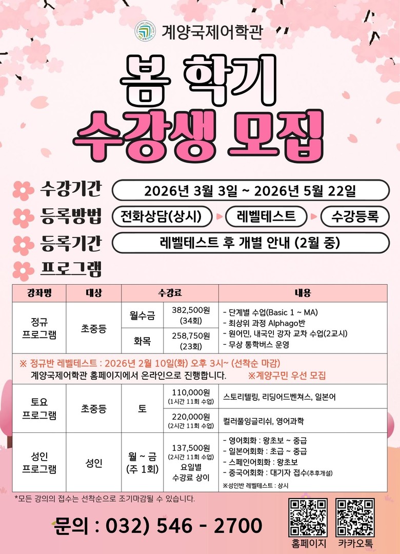 수강 등록은 레벨테스트 이후 개별 안내를 통해 이뤄지며, 자세한 사항은 계양국제어학관 누리집(www.gglc.or.kr)을 확인하거나 전화(☎032-546-2700)로 문의하면 된다.