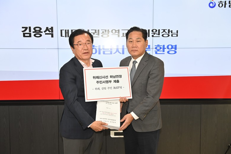 첫째, ‘위례신사선 하남연장’ 노선의 제5차 광역교통시행계획 반영을 강력히 요청했다. 이현재 시장은 위례·감일 주민 1만 8,637명의 염원이 담긴 서명부를 전달하며, “위례신도시는 3개 지자체에 걸친 단일 생활권으로 계획됐고, 하남시민 역시 교통분담금을 부담했음에도 하남시만 철도교통에서 배제되어 있다”고 지적했다. 이어 “약 14년간 추진된 민자사업이 최종 유찰되어 서울시 재정사업으로 추진 중인 만큼, 올해 12월 수립 예정인 ‘제5차 광역교통시행계획’에 위례신사선 하남연장 노선이 반드시 포함돼야 한다”고 강조했다.