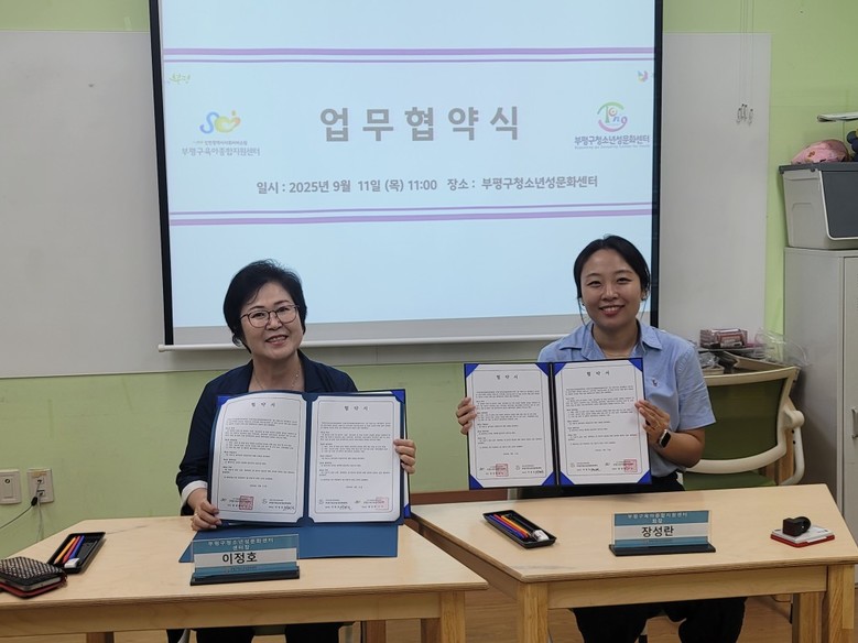 [부평구 세계타임즈=심하린 기자] 부평구(구청장 차준택) 청소년성문화센터(이하 센터)는 지난 11일 부평구육아종합지원센터와 업무 협약을 체결했다.