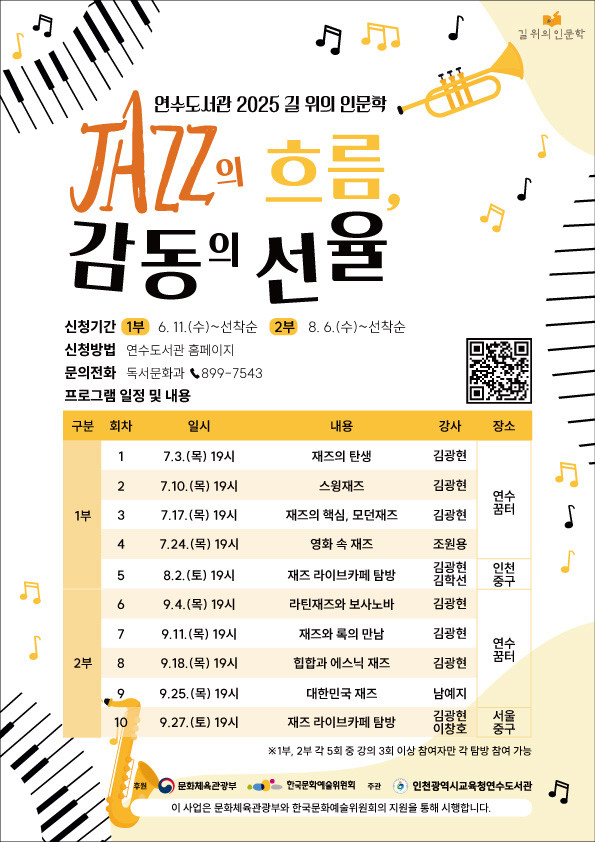 [인천 세계타임즈=심하린 기자] 인천광역시교육청연수도서관(관장 서경희)은 문화체육관광부 주최, 한국문화예술위원회 주관의 2025년 ‘길 위의 인문학’ 공모사업에 선정돼 ‘재즈의 흐름, 감동의 선율’을 주제로 프로그램을 운영한다.