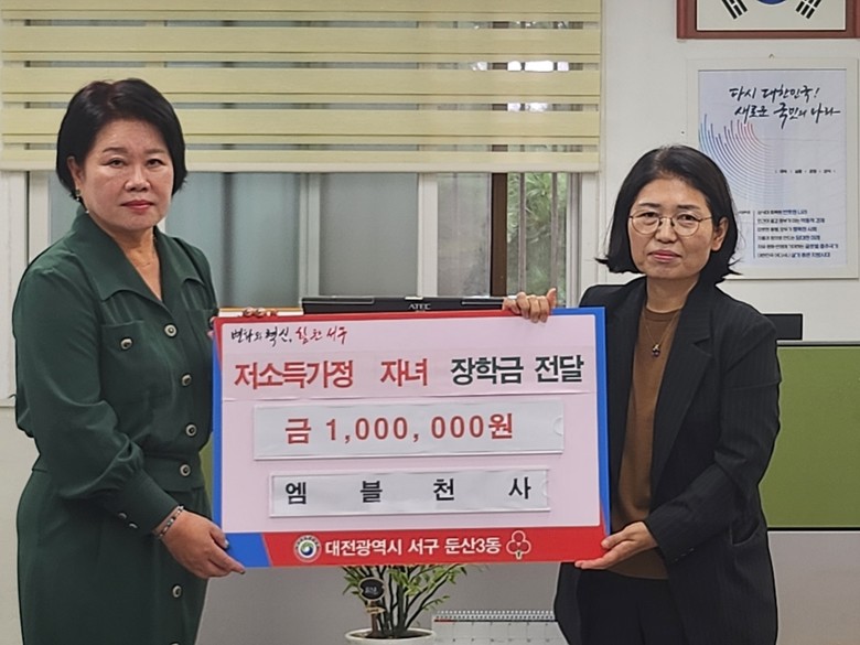[서구 세계타임즈=이채봉 기자] 대전 서구(구청장 서철모) 둔산3동 행정복지센터는 엠블천사 장학회(회장 홍숙희)로부터 저소득 청소년을 위한 장학금 100만 원을 후원받았다고 2일 전했다.