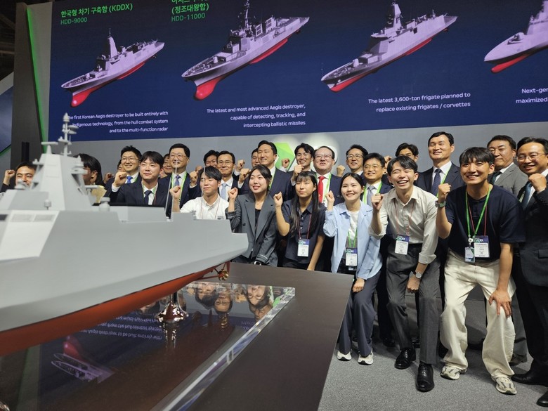 정기선 HD현대중공업 부회장은 LIG넥스원이 공동으로 진행한 리셉션 행사에 참석해 "HD현대는 대한민국 첫 전투함인 울산함을 시작으로 총 106척의 함정을 제작, 이 중 18척을 해외에 수출했다"고 소개했다.정 부회장은 그간 축적해온 함정 건조 기술력과 미래 전장 대응 능력을 바탕으로, 대한민국을 넘어 글로벌 해양 안보를 책임지는 선도기업으로 도약하겠다는 의지를 밝혔다.한화오션, 한화에어로스페이스, 한화시스템 등 한화 방산 3사는 통합관을 차리고 함정부터 에너지 시스템에 이르는 '미래 해양 통합 설루션'을 선보였다.한화오션은 무인함정 부문에서 전투용 무인잠수정(UUV)과 무인전력지휘통제함을 전시한다. 무인전력지휘통제함은 한국 해군의 해양 유무인 복합전투체계 '네이비 시 고스트'(Navy Sea GHOST)와 연계된 함정이다.수상함 부문에선 KDDX와 울산급 호위함 배치-IV, 태국 수출형 호위함을 선보였고, 잠수함 부문에선 3천600t급과 미래형 잠수함 등 다양한 모델을 제시했다.