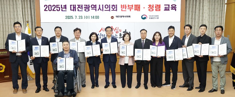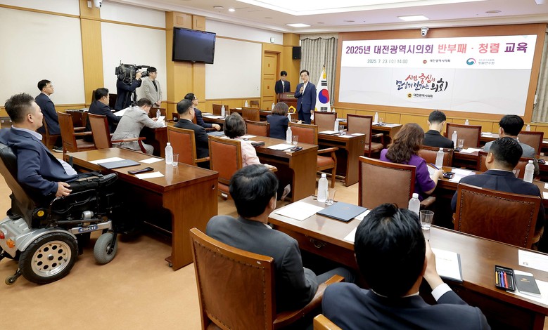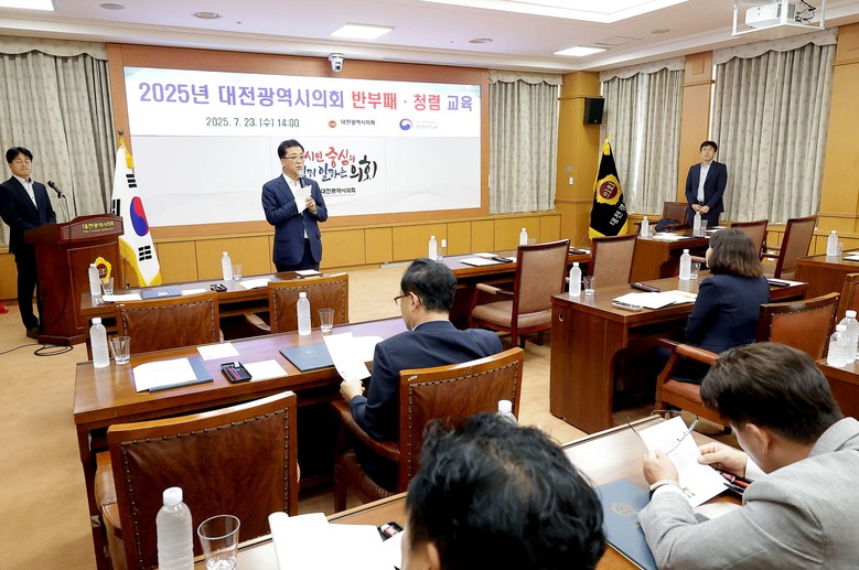 [대전 세계타임즈=이채봉 기자] 대전시의회(의장 조원회)는 7월 23일(수) 제288회 임시회 산회 후, 시의회 소통실에서 의원 및 의회사무처 직원을 대상으로 반부패 법령 중심의 청렴교육을 실시하였다.