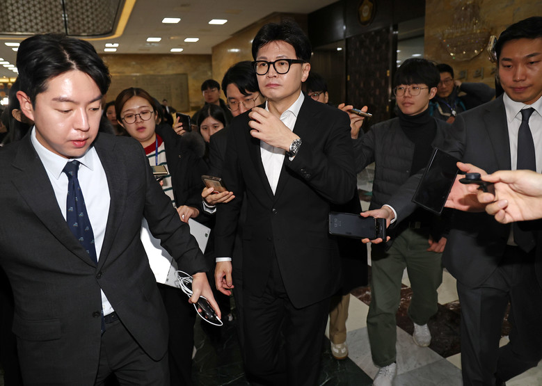 국민의힘 한동훈 대표가 대통령 탄핵 소추안 표결을 앞둔 14일 국회 비상의원총회 회의장을 나서고 있다. 2024.12.14