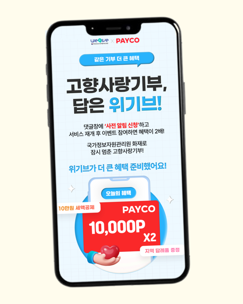 이번 이벤트는 국가정보자원관리원 화재로 고향사랑기부 서비스가 일시적으로 중단된 상황에서 기부자들의 참여 의지를 이어가기 위해 마련됐다. 기부 서비스가 정상화되기 전에 사전 예약을 접수하며, 참여자에게는 답례품 제공 및 세액공제와 함께 페이코 2만 포인트가 추가로 제공된다.