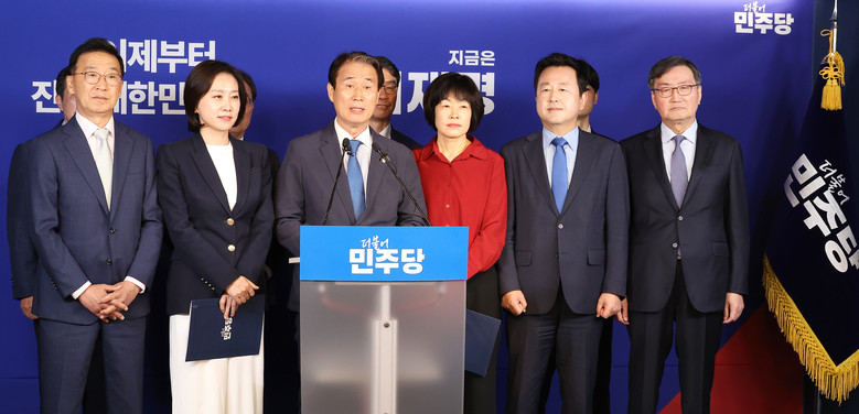 27일 서울 여의도 더불어민주당 중앙당사에서 열린 '진짜보수 민주보수 공동선언'에서 권오을 중앙선거대책위원회 국민대통합위원장과 허은아 전 개혁신당 대표, 최연숙 대구시당 선대위원장 등 참석한 인사들이 선언문을 낭독하고 있다. 2025.5.27