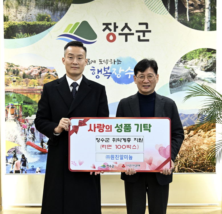 [장수 = 세계타임즈 김서주 기자] 장수군은 주식회사 원진 알 미 늄(대표 원태연)이 21일 군청을 방문해 지역 내 취약계층을 위한 라면 100상자를 기탁했다고 밝혔다.