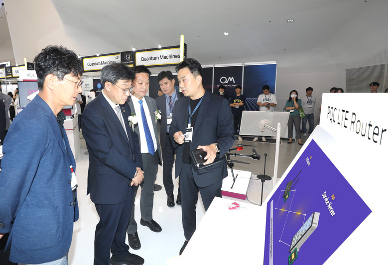 사진은 박윤규 과학기술정보통신부 제2차관(왼쪽 두번째)과 황종성 한국지능정보사회진흥원장(왼쪽 세번째)이 LG유플러스 전시부스를 방문, 양자내성암호 관련 기술 설명을 듣는 모습.