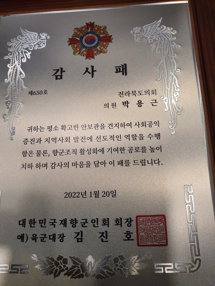 [전북=세계타임즈 김동현 기자] 전라북도의회 박용근 의원(행정자치위원회, 장수)이 20일 대한민국재향군인회(회장 (예)육군대장 김진호)로부터 감사패를 수상했다.