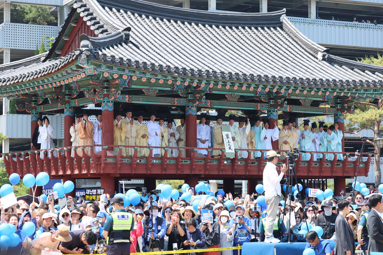 제21대 대선을 이틀 앞둔 1일 더불어민주당 이재명 대선 후보의 유세가 열린 경북 안동시의 웅부공원에서 이 후보를 지지하는 안동 유림들이 연설을 듣고 있다. 2025.6.1